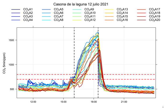 En la siguiente figura se puede observar un ejemplo de las mediciones recolectadas en uno de los centros de eventos. Entre las líneas punteadas se observa como aumenta la concentración de CO2 cuando este es inyectado por el sistema recreando una actividad sin tener un sistema de ventilación y luego se observa como decae drásticamente cuando se abren las ventanas y puertas del recinto (ventilación natural).