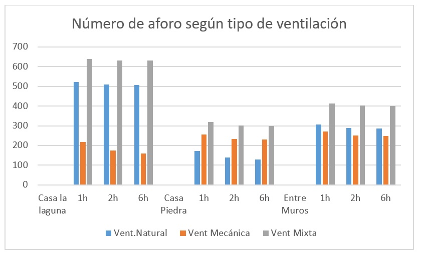 En el siguiente gráfico se puede observar como varía el aforo según el tipo de ventilación y hora de duración de la medición en cada centro de evento.
