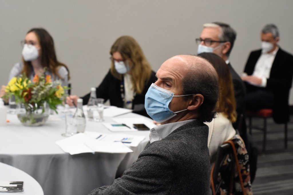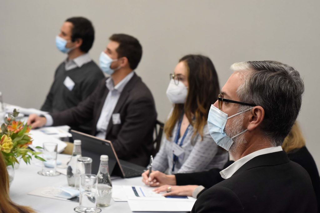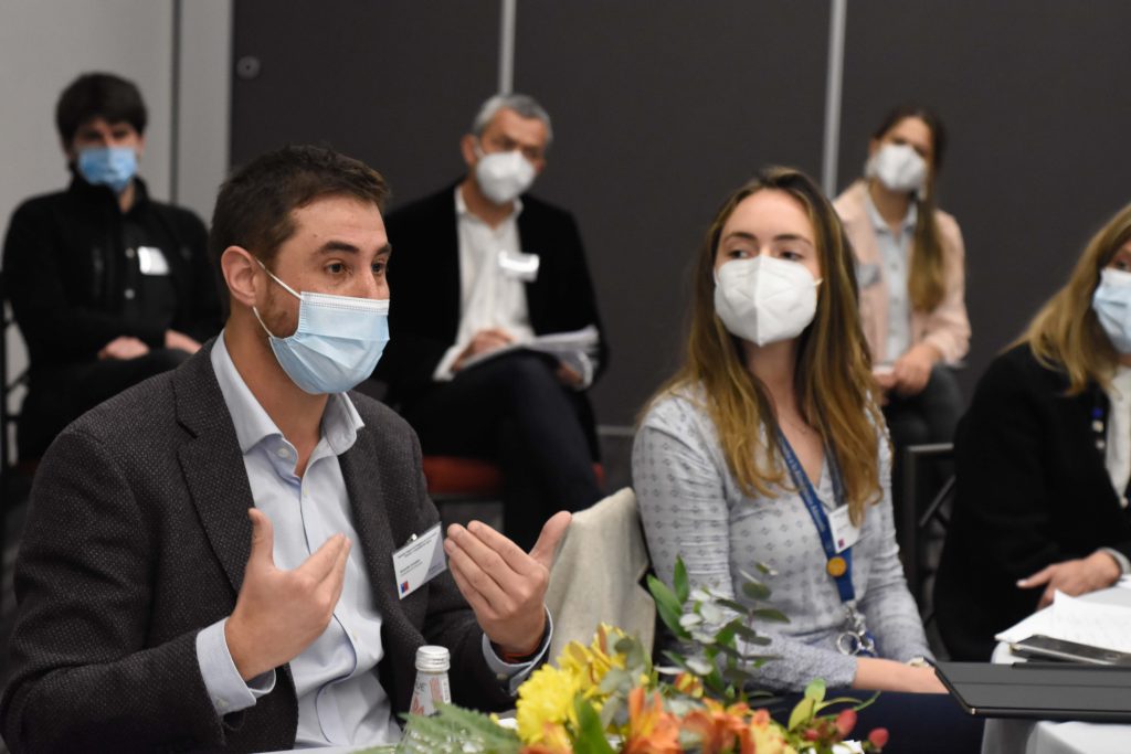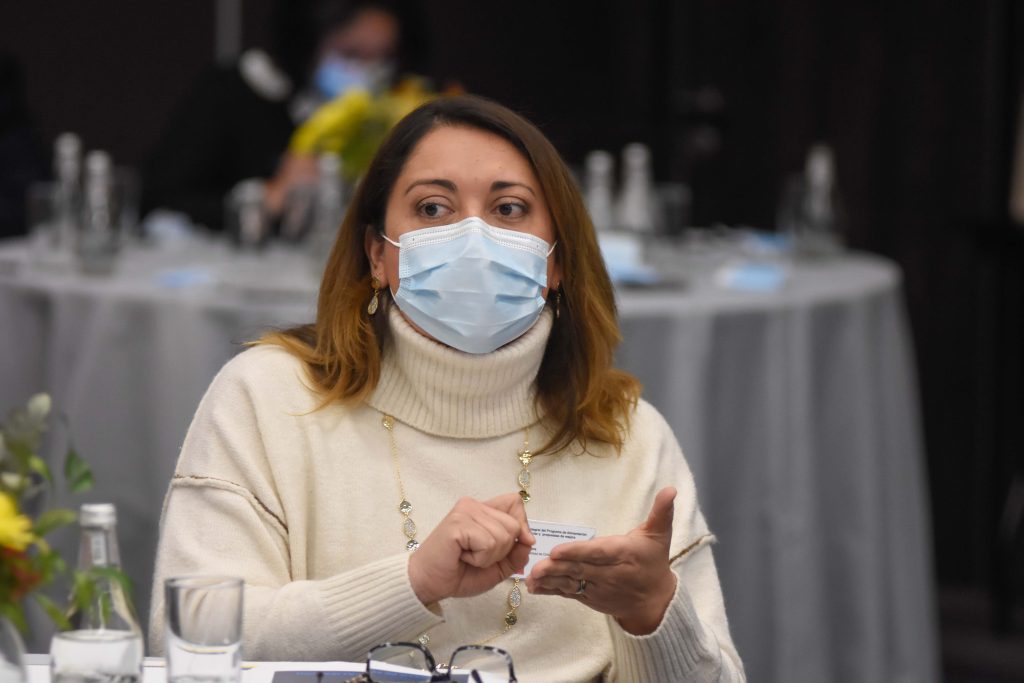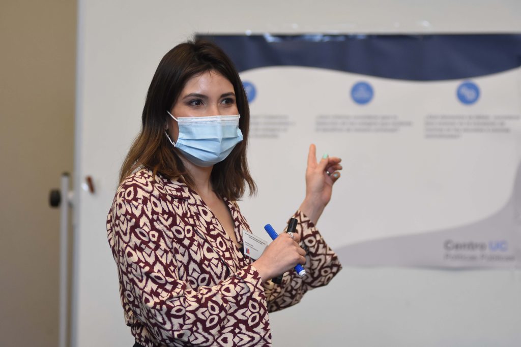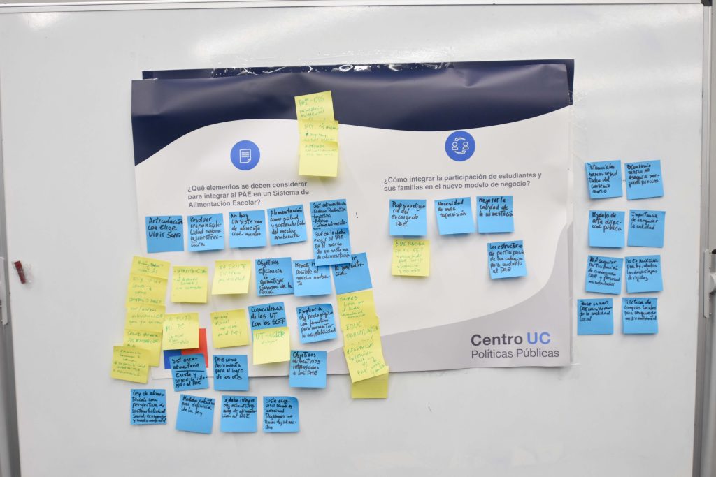 A continuación, Nicolás Muñoz y Dominique Keim, del Centro de lo Políticas Públicas UC, presentaron las propuestas de diseño, del modelo de negocios, del modelo de focalización y provisión del servicio, y además abrieron las discusiones grupales. Las conversaciones se centraron en responder cinco grandes preguntas; ¿Qué elementos se deben considerar para integrar al PAE un Sistema de Alimentación Escolar?, ¿Cómo integrar la participación de los estudiantes y sus familias en el nuevo modelo de negocios?, ¿Qué debemos priorizar? Cobertura focalizada en estudiantes vulnerables o reducción de número de colegios al que se llega de forma focalizada, ¿Qué criterios considerar para la selección de los colegios que recibirán el beneficio de manera universal? y ¿Qué elementos se deben considerar para avanzar en la transición de cocinas en las escuelas a cocinas centralizadas?